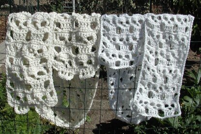 Part of my Skull a Day for a Year project. Hand Crochet scarf with a pattern of skulls. This is a companion piece to my hat and glove patterns. The skulls are stacked instead of alternating because it was the simplest way to make them. Alternating skulls would have called for 1a half skull on every other section, and I didn't like the way it looked. Pattern is for 2 weights of yarn, Sport or Worsted. Sport weight uses about 400 yards. Worsted about 300 yards. The pattern turns over half way so the skulls face upright on both ends. The finished measurements are 6 inches wide by 60 inches long. There are pictures of every row, and an option to make the stand alone teeth on every row. Every effort has been made to make these instruction error free and clearly written. My e mail address is included for help. If you find an error, I would appreciate if you would let me know. I will send you a free pattern of your choice as a thank you.