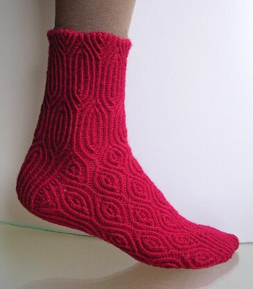 The almond shaped rib pattern of these socks shows up nice and clearly due to the enhanced stitch definition of the twisted stitches. With the elasticity of the ribbing, the socks will have an excellent and comfortable fit.