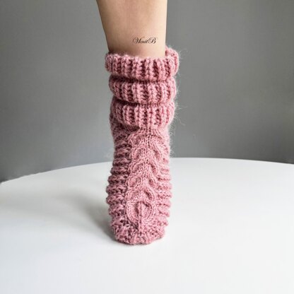 The Crew Socks are cosy and warm home / slipper socks for the cold winter days. They are worked flat, cuff down with only 1 seam. These socks are knitted using an easy-to-remember pattern and suitable for any worsted, afghan or aran yarn. Why not with DK held together?!