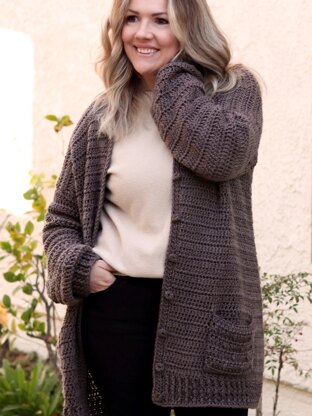 This oversized comfy cardigan will make any moment that much more cozy. This works up in easy to create panels with fun textures on the sleeves and pockets. Crochet button instructions are included or you can accessorize the one with store bought 3/4 inch buttons.