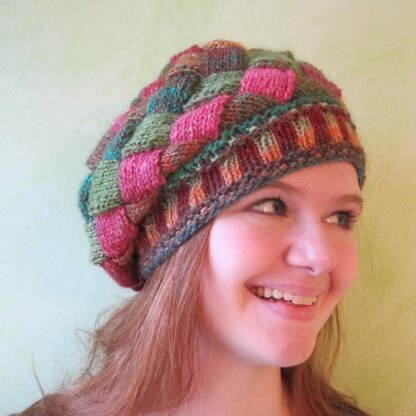 This hat is made with only 2 skeins of Noro Silk Garden and has plenty of fun techniques, such as a slipped-stitch edging, and a small bit of fair-isle before you get to the entrelac.
