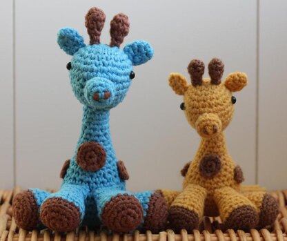 Yarn / hook combination can be chosen based on personal preference, but for the two giraffes pictured: The smaller, yellow giraffe is about 5" tall and uses double knit woollen yarn on a 2.5mm hook and requires approximately 20g of yellow + a small amount of brown; The larger, blue giraffe is about 6.5" tall and uses Aran weight cotton yarn on a 3mm hook and requires approximately 30g of blue + a small amount of brown. (Giraffe pictured uses Rico Creative Cotton shades 56 and 36. Some suggested substitutes may be shown below.)