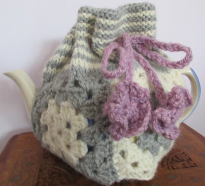This is a pattern for a Crochet and Knit Tea Cosy. The lower part is made up of four granny squares, with stitches picked up and knitted to the top. Eyelets and a tie fasten the top, with flowers at the end of the tie. The top border is in garter stitch.