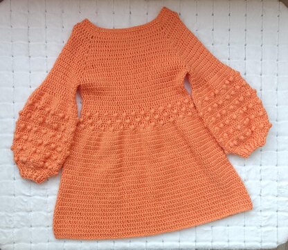 This is a handmade crochet dress featuring a bright orange hue, designed with a flared skirt and textured puff sleeves. The waistline is accented with a beautiful bobble stitch band, adding charm and detail to the overall look.