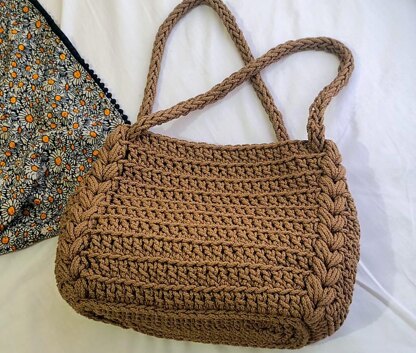 This is a one size bag that is done mainly with double crochet. materials: yarn (macrame- 265 yards), 5 stitch markers, 5mm crochet hook,scissors