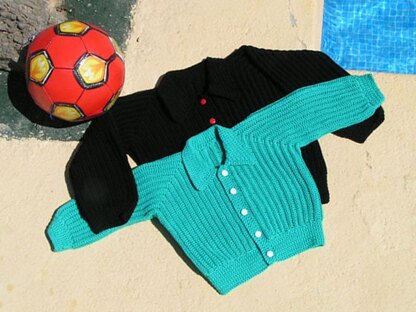 This stylish crochet bomber jacket uses a basic stitch and is worked in four main pieces. Join them with crochet seams and add the final details of collar, cuffs borders. Great for boy or girl - neat and practical too!