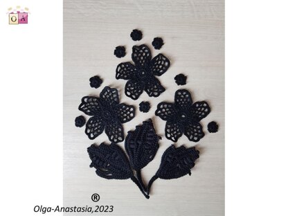 Crochet composition of flowers and leaves in black. Modern crochet pattern . A detailed pattern for all crochet motifs - a graphic diagram, a photo and a verbal description of each crochet row. PDF file for 25 pages Design work by Starostina Olga.