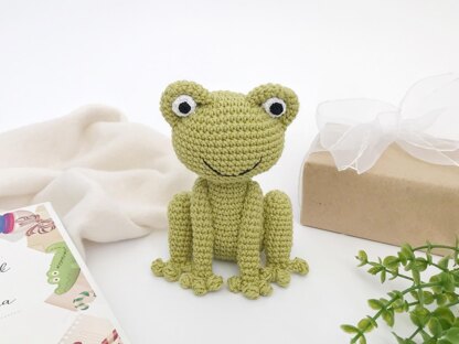 The finished crochet frog toy is about 5 inches (12 cm) tall. But this will vary depending on the size of your yarn and crochet hook.