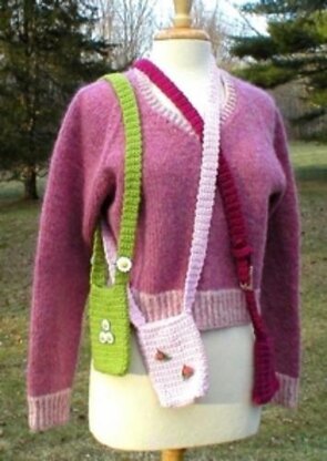 About the Design: These bags are the perfect size for a cell phone or car keys, credit card and lipstick! The magnetic snaps keep the top opening secure. They’re easy to crochet and come in 3 styles - a basic bag with shoulder strap, a bag with a buckled adj. long strap, and a bag with buttoned adj. long strap and a shaped bag bottom. Each bag uses only 2 balls of Heirloom Breeze, a cotton/wool/lycra blend stretch yarn that’s comfortable to work with.