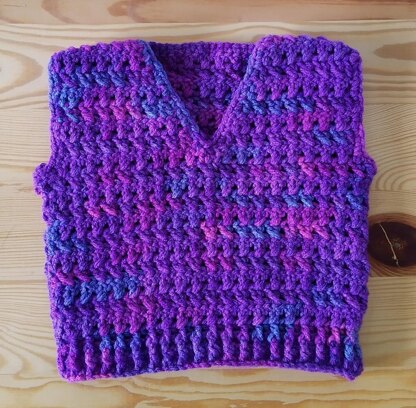 Worked in two panels and seamed together, this vest is available for sizes 6, 12, 18 and 24 months.