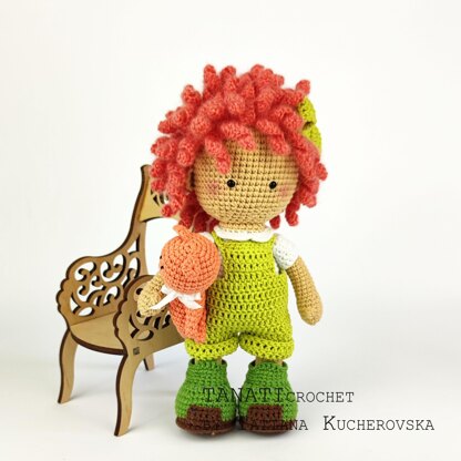 Material: • yarn - YarnArt Jeans (55% cotton / 45% acrylic) and ALIZE Angora Gold (20% wool / 80% acrylic) - for hair • hook 2.0 mm • soft stuffing • 2 black safety eyes 6 mm • pins for sewing parts at the right spot • needle for sewing • scissors • pink blush