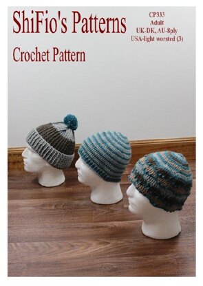 Materials:UK double knitting, AU 8ply yarn, USA light worsted (3) Women's Institute, grey (C1), teal (C2), choc (C3), biscuit (C4) Ribbed hat - C1-50g/1.7ozs, C2-25g/0.8ozs, C3-50g/1.7ozs Striped Hat - C1-30g/1oz, C2-25g/0.8ozs Mountain Beanie - C1-30g/1oz, C30g/1oz, C3-15g/0.5ozs, C4-15g/0.5ozs Crochet hook USA E, UK 3.5mm