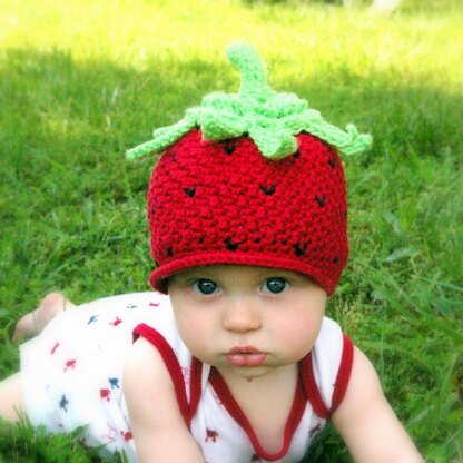 Crochet pattern strawberry beanie hat with peek-a-boo brim