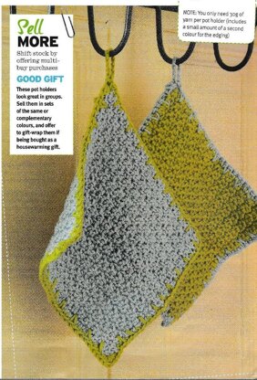 This is a pattern for Crochet Pot Holder, originally published in Craftseller. It is a simple textured stitch with a contrast edging. These could also be made into place mats or coasters by adjusting the size and omitting the loop. You will need one ball of each colour (30 gms used per holder). Photo Craftseller.
