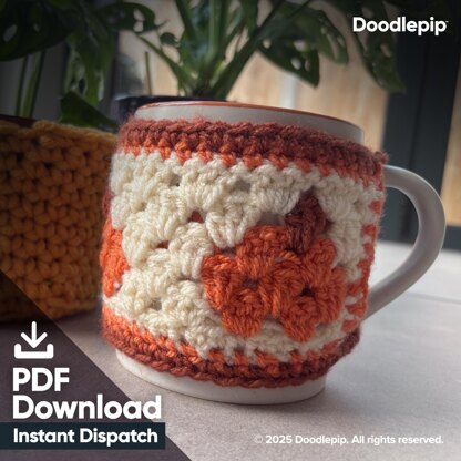 Add a charming touch to your coffee routine with our handmade crochet granny stitch mug cozy pattern featuring adorable pumpkin motifs. Designed to keep your drinks warm and your hands comfortable, the cozy straps securely wrap around your favorite mug for a snug fit. Perfect for fall, Halloween, or cozy mornings, it's a delightful accessory that combines functionality with autumnal festive style.