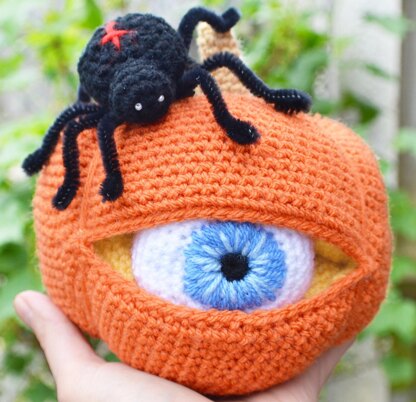 Crochet Pumpkin with one eye and red cross black spider. A great decoration idea for Halloween.