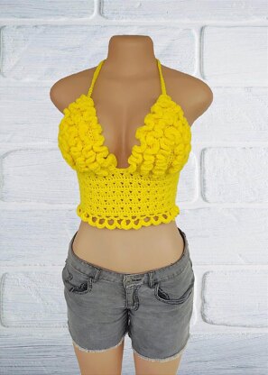 This crochet ruffle crop top has a cute ruffle detailing just the has the name implies. It works up pretty fast and easy. It is a very easy pattern. It contains instructions for 6 sizing options, bust 32(34,36,38,40,42) inches