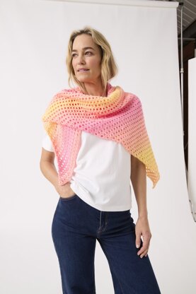 A generous shawl from just one ball of Jewelspun Ombre! This crochet pattern uses a simple two- row eyelet stitch repeat to create a light, airy fabric with beautiful drape. As you increase from the tip of your shawl, the bands of gorgeous Jewelspun Ombre colour become progressively narrower, creating an effortlessly stunning colour effect. Slight variations in the start point make each ball of Jewelspun Ombre unique, which means that the colour placement in your project will be unique too.