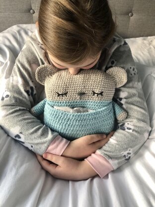 This listing is for my original crochet amigurumi Sleepy Time Bear pattern. Includes instructions to make a removable, microwavable, fabric heat pack for a cozy bedtime or nap buddy. Microwave the heat pack to warm and soothe or freeze to cool off or relieve boo-boos. The pattern is super easy to make, I have included lots of photo to help you along the way! The finished Bear measures 11 1/2 inches tall, and 12 inches wide Materials: Worsted Weight yarn: Light Grey, and Blue Scrap of Black and Dark Grey yarn or thread (for nose and eyes embroidery) Poly-fill stuffing Size G crochet hook Yarn Needle Stitch Marker Heat Pack: 14 inches by 5 inches flannel fabric 1 cup of rice (not instant) Thread and sewing needle (or a sewing machine) Techniques: Single crochet Half Double Crochet Increasing and Decreasing Crochet in a spiral and flat