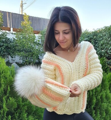 This sweater is simple and easy to make, adaptable for any size. It is matched with the hat and very suitable for winter. It is also elegant and can be worn with pants or skirt. I use for S size almost 5 skeins. Each skein has 200 gr and 120 m. The crochet 10,00 mm and 8,oo mm.