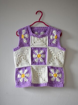 Checked vest with my retro flower granny square and a solid granny square! Can also be done with just flower squares or just solid squares. Perfect for all seasons, can be made with arylic for a cozier feel or cotton making it perfect for spring/summer. Intermediate crochet level but once you get a hang of the squares it is easy.