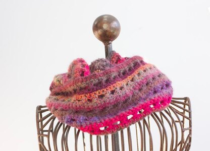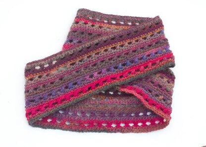 The cowl is crocheted in the round with a pretty cross stitch pattern. It is a flexible pattern that can be made in a variety of yarns and sizes. Its easy to change the size to make a little neck warmer or a big thick scarf .