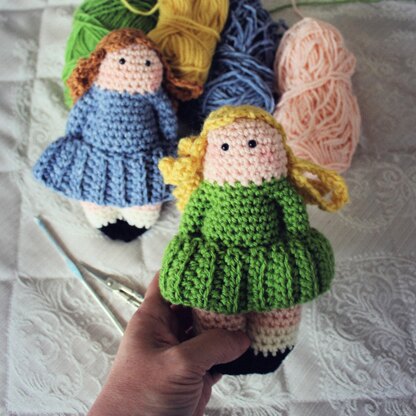 About the Pattern: A cute crocheted version of a sock doll…minus the sock! Made in one piece from head to toe, the legs and arms are formed simply by sewing through the completed doll body. Hair is made separately and sewn in place with a yarn needle.
