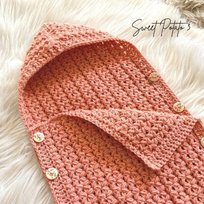 An adorable hooded cocoon made in a luxurious textured stitch makes this a must have pattern for baby! What a fun, unique and one of a kind gift this would make. The hooded cocoon is easier to lay a sleeping baby into for photos then just fold up and button close, much easier than a tight cocoon. The Cocoon buttons on both sides to allow for easy placement in and/or out. This cocoon is made as one piece and the pattern includes sizes 0-3 month, 3-6 month, and 6-12 month.