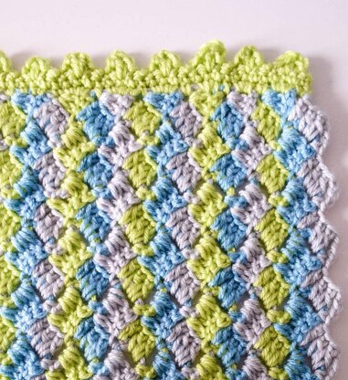 This simple stitch pattern creates a delightful chevron without complicated decreases. Carry the unworked yarn up the side and then cover with a border to minimize the number of yarn tails you need to weave in. This beautiful unisex blanket makes a perfect gift for a baby shower or as a donation to your favorite children’s charity.