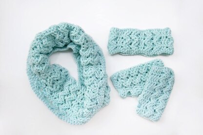 The Crossing into Winter set offers you a cowl, ear warmer and fingerless mitts made with a reversible cable. Add warmth and style with these layering pieces that can be worn together or separately.