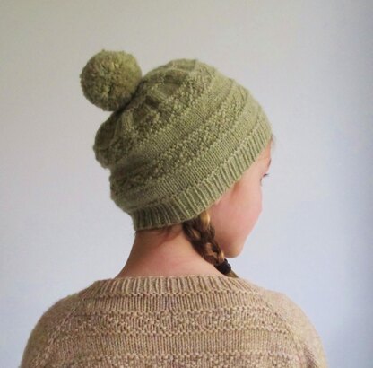 This hat is worked in the round from the bottom up, and is finished with a pom pom.