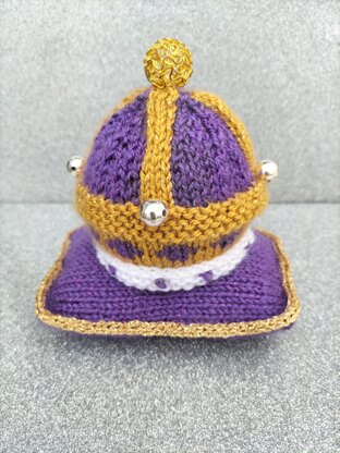 This has been designed with the forthcoming Coronation in mind. It is a Digital pattern of a Crown chocolate orange cover and cushion. This chocolate orange cover can also be adapted to make a hanging decoration for your window to display on the Coronation Day. It is knitted in King Cole Glitz dk wool and James C Brett dk wool. In Antique Gold, Diamond White and Violet. A pair of 3.25mm / US 3 needles are required. Ive used Anchor metallic thread for the I cords but you could use the Antique gold instead. Other materials required are a few beads and a button for the cushion
