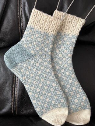 These socks, named CRYSTAL, are knitted from leg to toe with a jacquard chart.