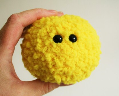What you will need: 2 knitting needles (US3/3.25mm or as per tension advice),10-15g chunky and fluffy yellow yarn (e.g. King Cole Cuddles Chunky 1699 ‘Sunshine’), Two black toy safety eyes (9mm), Polyfil toy stuffing,1 tapestry needle for finishing