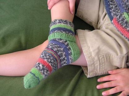 Use leftover solid and self-patterning sock yarns from your stash to knit these special socks with a fancy cuff. Knit socks in four sizes from little toots to big kids.