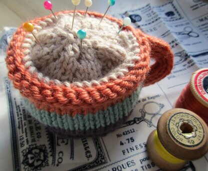This is a pattern for a Cup of Tea Pin Cushion. It is made in three pieces. The base is a circle in stocking stitch made by increases, the side stocking stitch, and the tea is a circle knitted the same as the base. The handle is in stocking stitch. Small amounts of yarn are used, a wool mix dk is used on the sample. You will also need toy stuffing and a circle of card for the base. Base 7 cm wide, cup 5 cm tall.