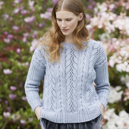'CURLEW' is a lovely semi fitted textured sweater with 3/4 sleeves, using Erika Knight's British Blue 100 yarn. The stitch design is made up of lace and cable panels. Please note that this design is knitted flat in pieces and I hope you will enjoy knitting and wearing this design.