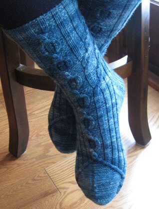 These intricate socks are worked from the cuff down and showcase a variety of textural stitches. The center panel features both cables and lace and is framed by diagonally travelling cables and ribbing. The pattern includes written instructions and charted stitch patterns. The left and right socks are similar but not identical.