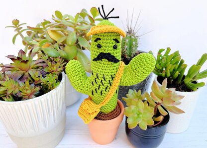 Meet Curtis the Cactus, the slickest succulent in town with a twinkle in his eye and a whole lot of charm! This quirky crochet character is dressed to impress, rocking a jaunty sun visor, a dapper black moustache, and just enough chest hair to make a statement. Tucked into his classic terracotta pot and carrying a trusty messenger bag, Curtis is always on the go—spreading good vibes and maybe a few tall tales along the way.