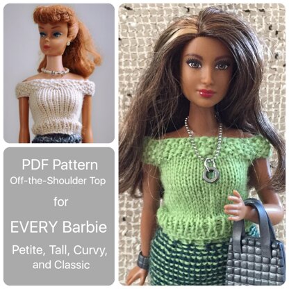 This is a knitting pattern for an off-the-shoulder top with instructions for ALL of Barbie's body types.