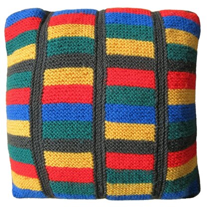 It is knitted in garter stitch strips which are then joined together. The cushion in the photos was made with Aran yarn. You could use any thickness but the overall size might be different.