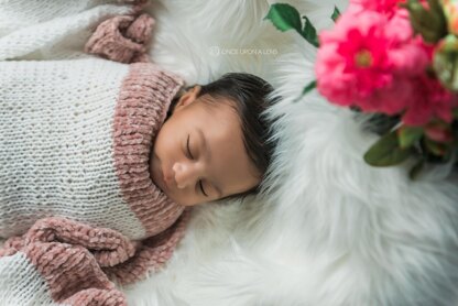 This beginner-friendly pattern is for a knitted newborn baby wrap that is worked up flat in simple stockinette stitch with bobbles along the side and finished off with a velvet border at the top.