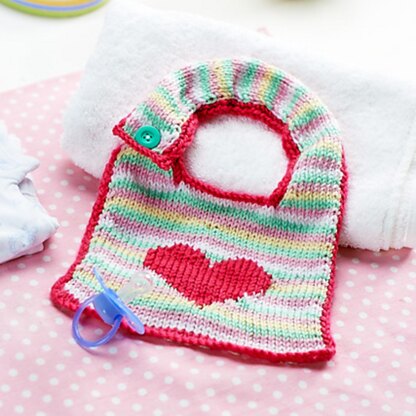Practise your colour-work skills with this cute baby bib. This is knit in stripes, with Swiss darning (duplicate stitch) embroidery to add the heart when finished. The side edges are added by picking up and knitting stitches along an edge. Designed by Amanda Berry @fluffandfuzz, the bib is knitted in acrylic DK yarns on single pointed needles. For confident beginners and above, other techniques used include casting on and off, knits, purls, k2tog decrease and yarnover increase, and a little seaming to finish.