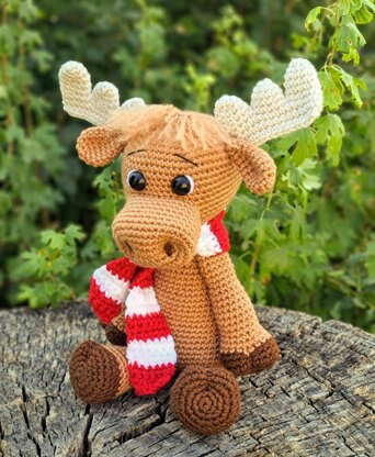 The moose is made working in continuous rounds. It measures approx. 12” tall when sitting, these measurements are when Medium Weight Yarn (4) and a 3.5 mm hook are used. Any weight yarn and correlating hook size could be substituted as long as all the colors of yarn are the same weight.