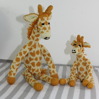 This is my Cute Mother and Baby Giraffe Toys knitting pattern. These gorgeous toy giraffes are easy to make.They are worked flat on 3 mm needles in any dk / 8ply yarn of your choice and the colour work is done in a Fairisle style. The faces only require simple embroidery. The knitting pattern provides full instructions to make these fabulous toys and there are numerous step by step photos throughout. Mother giraffe is 18 inches tall and baby giraffe is 12 inches tall. These are presents for my new baby grandson Gus and I have made him a giraffe onesie to go with them. The madmonkeyknits Baby Giraffe Onesie pattern is FREE so why not grab that too!
