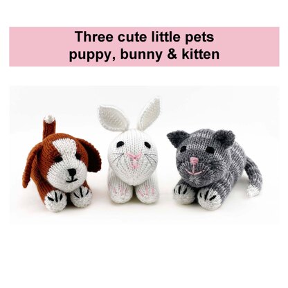 Three pets to knit, puppy, bunny and kitten. All approximately 15cm (6 inch) long. Create an irresistibly cute and cuddly puppy which captures all the endearing qualities of a puppy, from its floppy ears to its button nose and wagging tail. Or you may want to make a mischievous kitten or an adorable bunny with it's long ears and fluffy cottontail and you can make them in any colour you choose. The legs and body are knit all in one piece which means all the pets can be knit up very quickly. The pattern includes step-by-step instructions, making it suitable for both beginners and experienced knitters. Knit flat and seamed with lots of photos. All yarn amounts and step by step instructions are included in the patterns. ** SKILLS NEEDED TO COMPLETE ** HOW TO:Cast on Knit Purl Increase Decrease Cast off