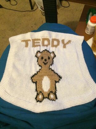 A cute Teddy Bear tea towel pattern, it does involve carrying yarn over to create the teddy bear picture and word, it is very cute and perfect size for a tea towel or even a little blanket for a baby to cuddle, it has plenty of uses and plenty of personality.