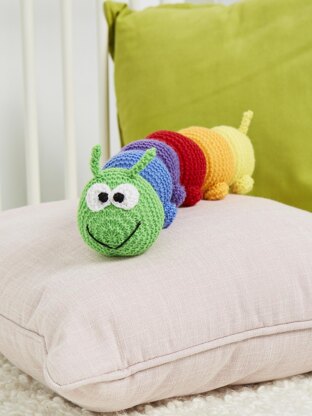 Cuthbert is a bright rainbow caterpillar who will brighten up any room. Knitted in garter stitch and with simple increases and decreases, this is an ideal pattern for beginner knitters who are new to making toys. Designed by Amanda Berry @fluffandfuzz, the caterpillar is knitted in acrylic DK yarns on single pointed needles (not in the round). For beginners and above, other techniques used include casting on and off, knit, work a kfb increase and k2tog decrease, and seaming to finish.