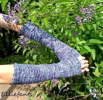 An elbow length pair of mitts with the heart shaped lace design from the cwtch shawl down the back of the hand and arm.