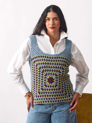A funky tank with enlarged granny squares forming the front and back, Cypress is a beautiful canvas for custom color palettes! Front and back pieces are worked in a modular fashion, with the yoke and sides building off the granny square centers, and they join at the sides with crocheted seams.